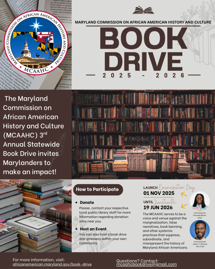 Now in its third year, MCAAHC invites Marylanders’ contributions to a statewide book drive. Donations of unused books in alignment with the MCAAHC mission are welcomed at sites across the state from Maryland’s Emancipation Day, November 1, 2025, through Juneteenth, June 19, 2026.
